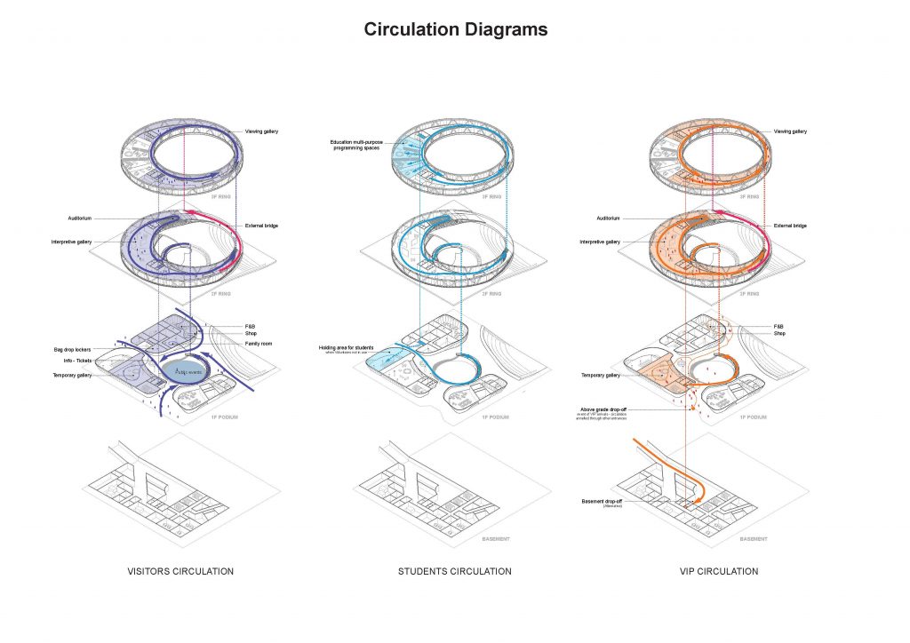 The podium is an open space where visitors are channeled into the center. This is called the origin: a symbolic common space for everyone, regardless of race, language or religion. Rising above is the circle, representing harmony and inclusiveness. The circle tilts towards the sky, as if Singapore’s aspirations have taken flight, against all odds. The journey cumulates in the viewing gallery, where a panoramic view of Singapore’s skyline awaits, upon which Singaporeans reflect on their past and embrace the future.